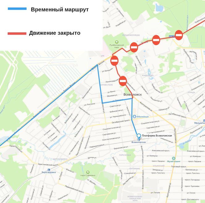 Отправление только от «Платформы Всеволожская». Далее автобусы проследуют по Всеволожскому проспекту, улице Плоткина и выйдут на обычный маршрут от остановки «Заводская улица».